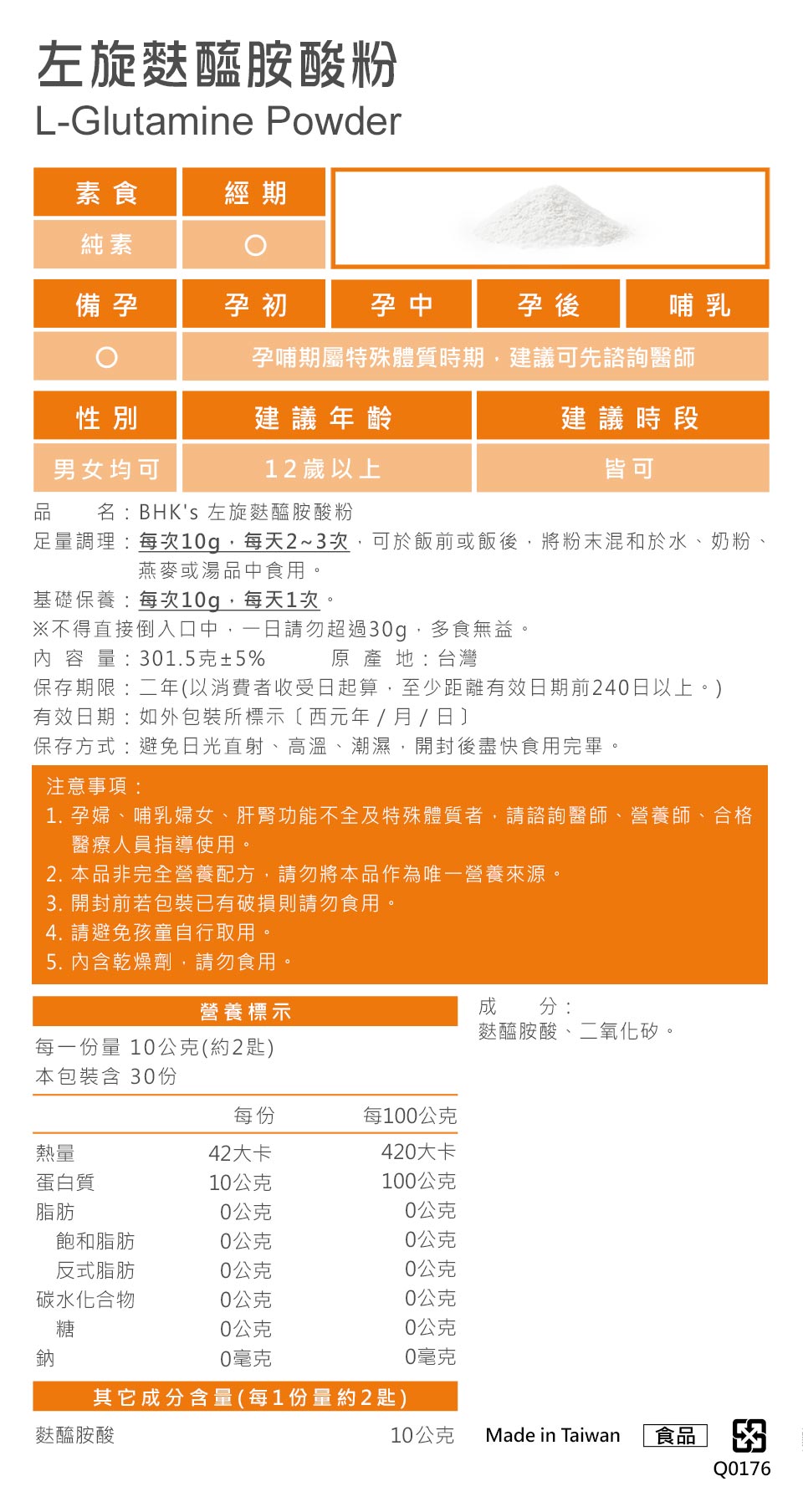 100%高純度左旋麩醯胺酸(Glutamine),補給身體所需的關鍵胺基酸。