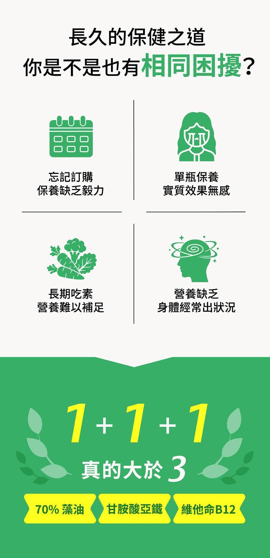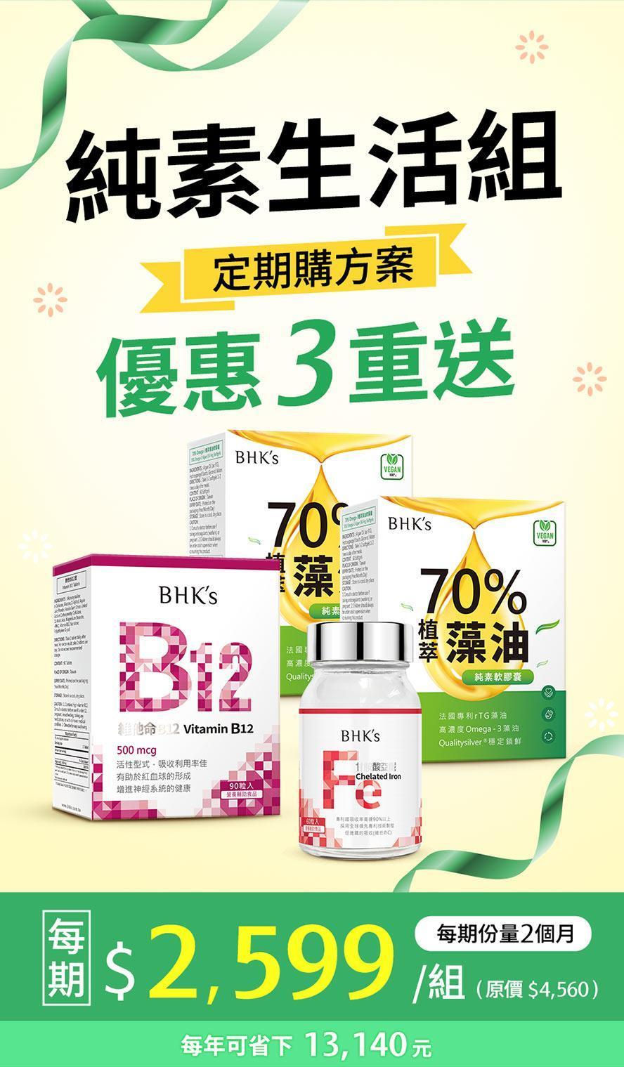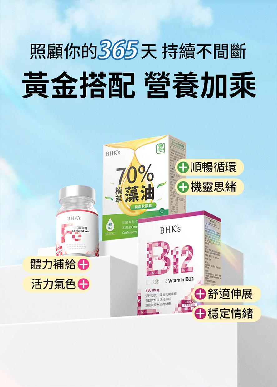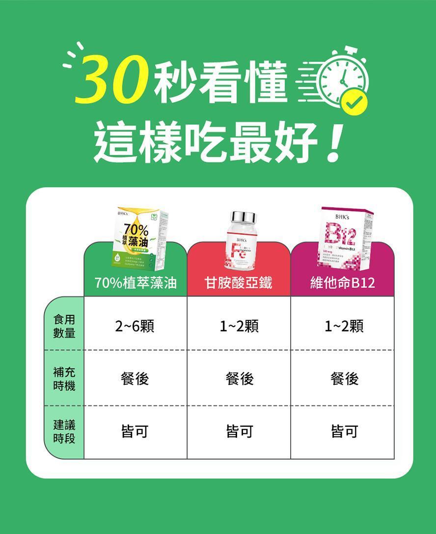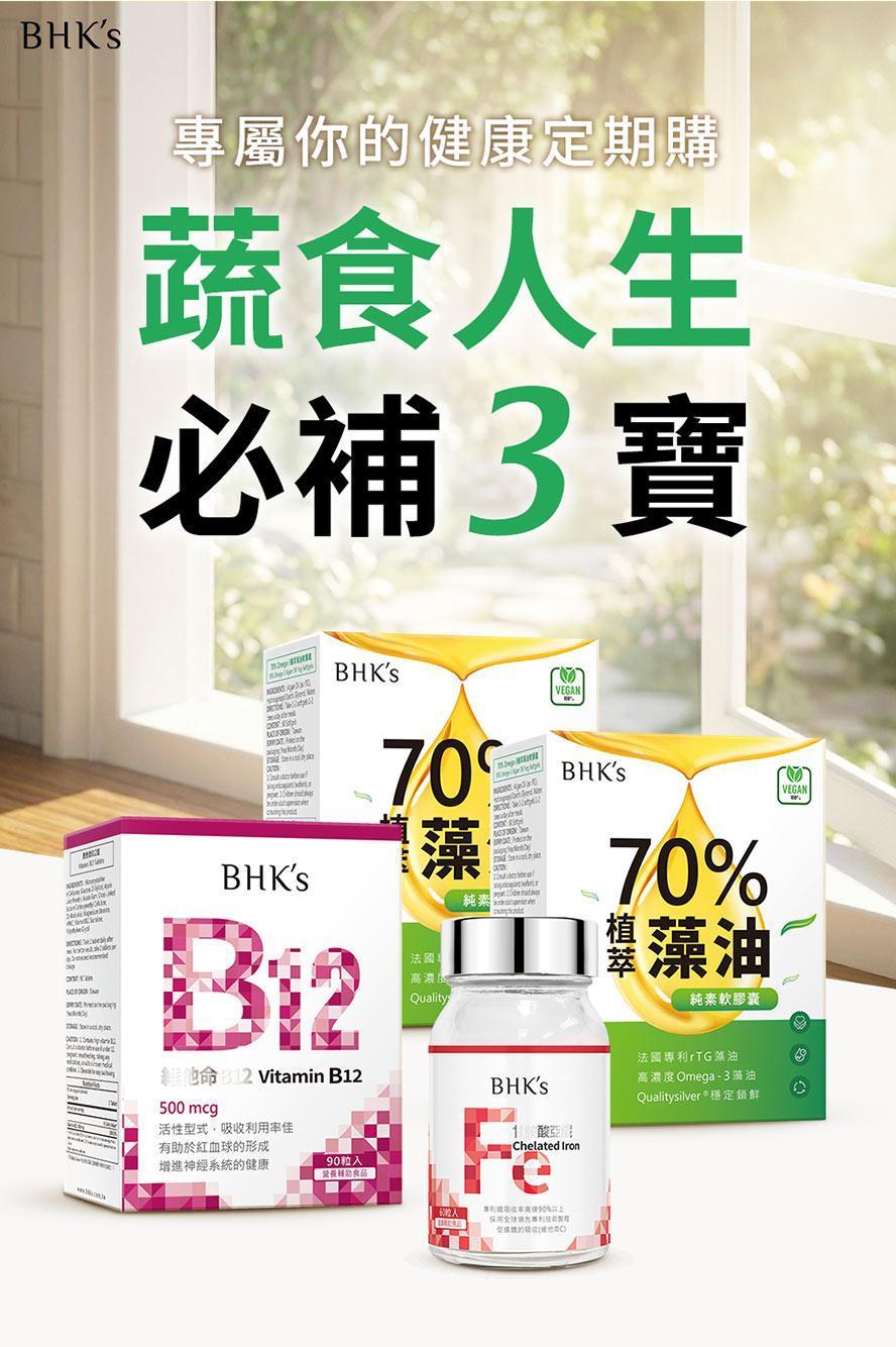 BHK's 純素生活組 甘胺酸亞鐵錠(60粒/瓶)+維他命B12錠(90粒/盒)+70% 藻油(60粒/盒)2盒【定期購優惠】贈:甘胺酸亞鐵錠 (30粒/袋)1袋
