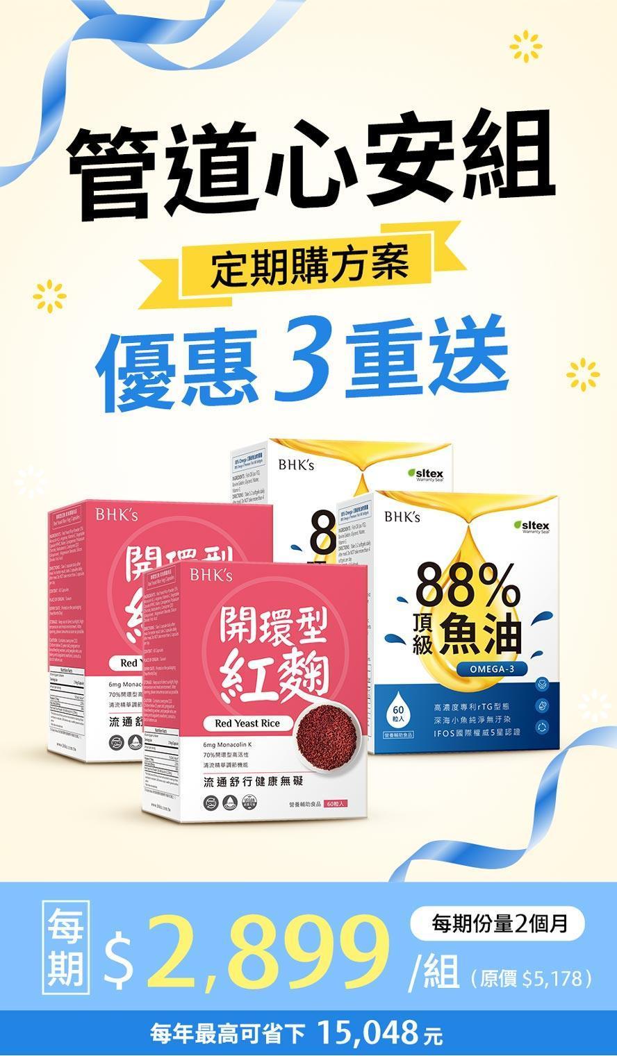 BHK's 管道心安組 開環型紅麴(60粒/盒)2盒+88% 魚油(60粒/盒)2盒【定期購優惠】贈:B群+鐵錠 (30粒/袋)1袋