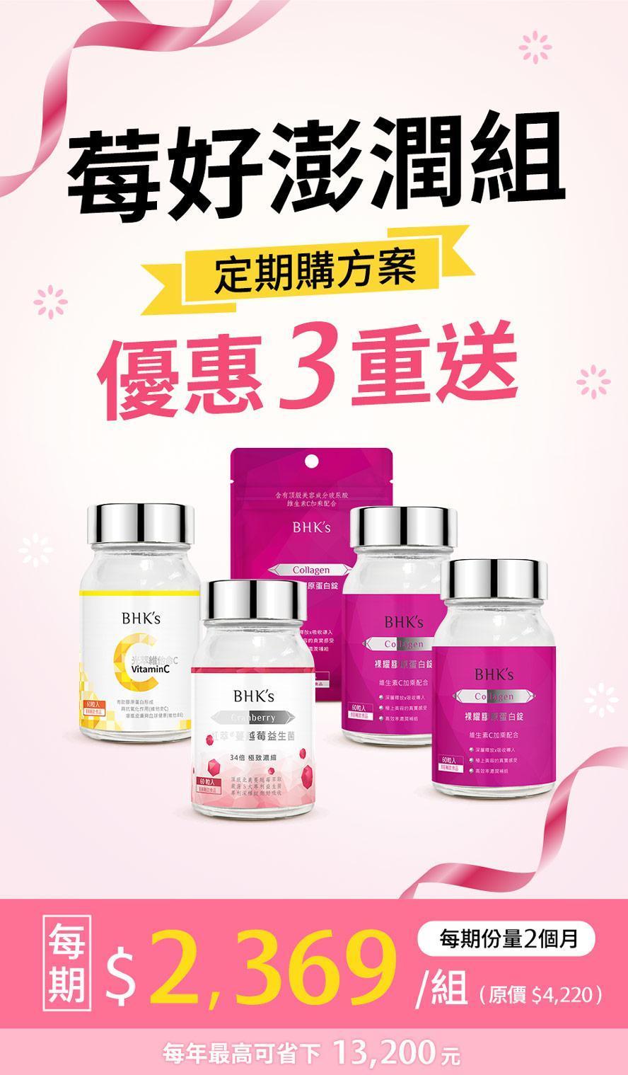BHK's 莓好澎潤組 蔓越莓益生菌錠(60粒/瓶)+膠原蛋白(60粒/瓶)2瓶+膠原蛋白(30粒/袋)+光萃維他命C (60粒/瓶)【定期購優惠】贈:紅萃蔓越莓益生菌錠 (30粒/袋) 1袋